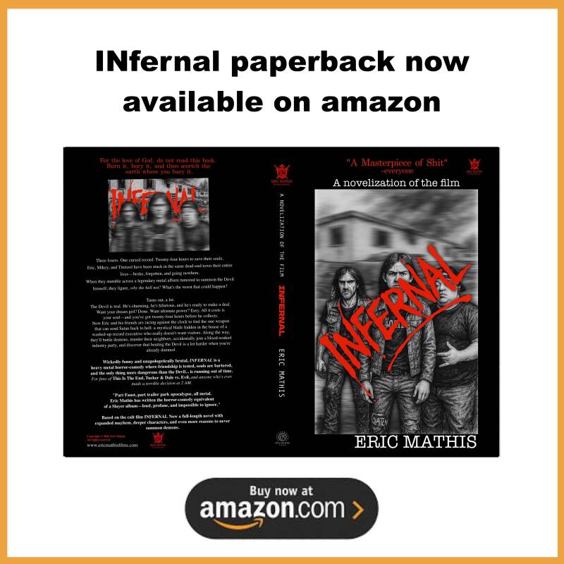 A wild, brutal, darkly funny descent into the cursed heavy metal world of INFERNAL. This novel dives deeper into the characters, the lore behind the record, and the demonic chaos that erupts across a forgotten town. Fans of the film will find new scenes, expanded backstory, and a richer, more twisted look at the devil’s game.