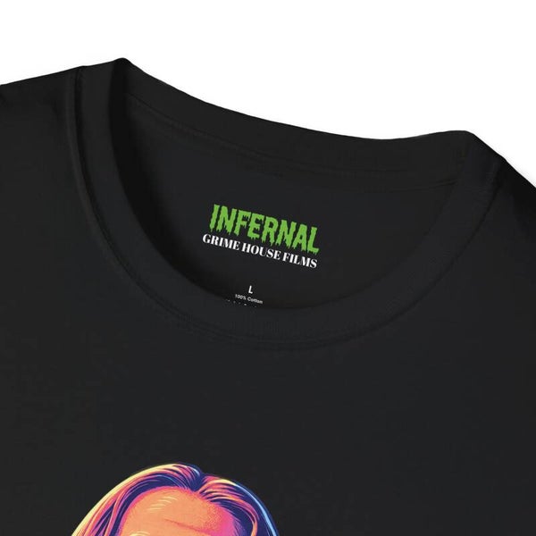 This tee captures Chad in glorious neon righteousness — golden locks, righteous stare, and that air of "Did he just bless me or curse me?" Glowing with celestial blues and infernal pinks, it’s the holiest abomination your closet has ever seen.