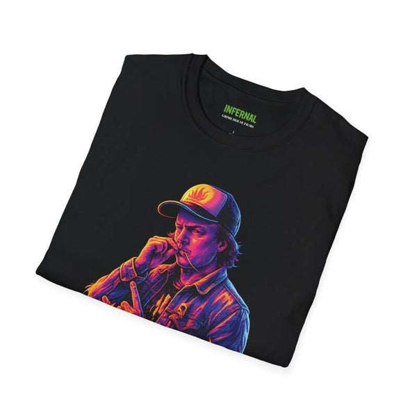 Meet Jason: the denim-clad stoner sage of INFERNAL—now forever captured in glorious, neon-drenched madness. With his vintage hat, devil horns raised, and a mouthful of mystery smoke, he’s either summoning ancient riffs or just forgot what he came in for.