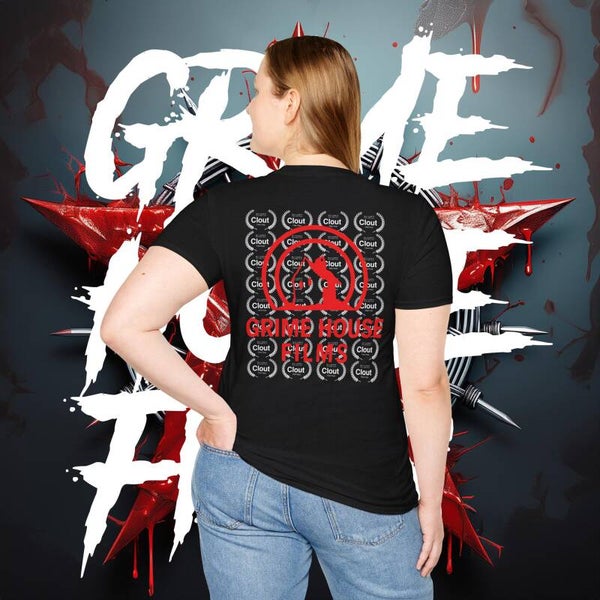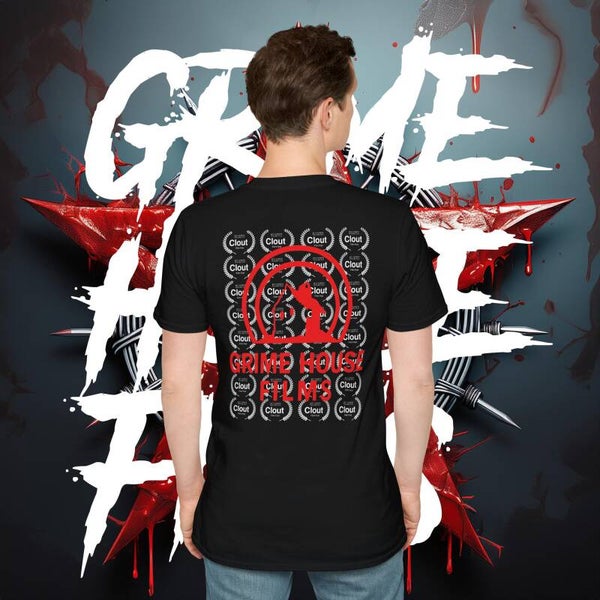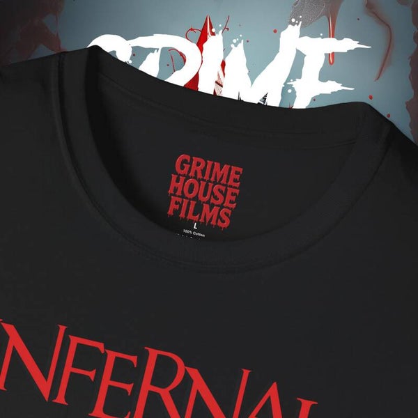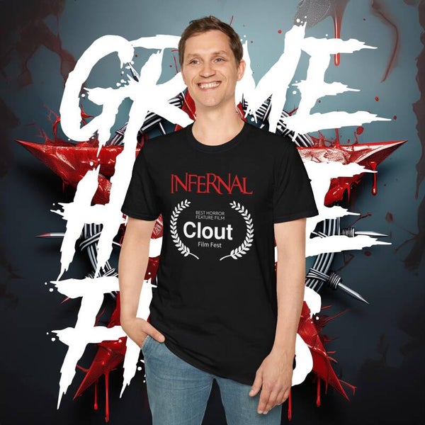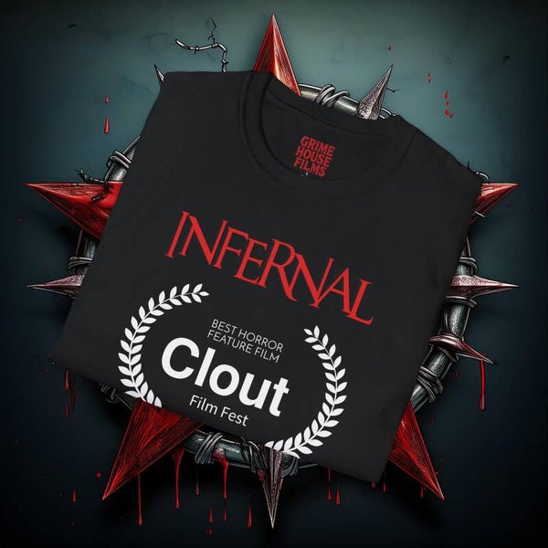 This exclusive Grime House Films T-shirt celebrates INFERNAL's victory at the Clout International Film Festival, where it was crowned Best Horror Feature Film. Featuring the official festival laurel stamped proudly on the front, and a hell-yeah wall of laurels on the back with our bold Grime House Films logo standing tall, this tee is a statement for true horror fans and indie film warriors.