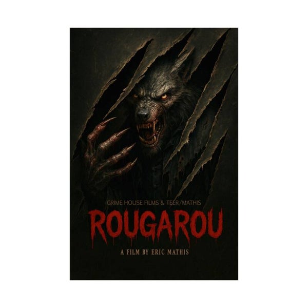 Tear through the veil of folklore with this limited edition 24x36 ROUGAROU poster, featuring the monstrous full-body reveal of the legendary Southern werewolf mid-emergence—fangs bared, claws ripping through the fabric of reality itself.