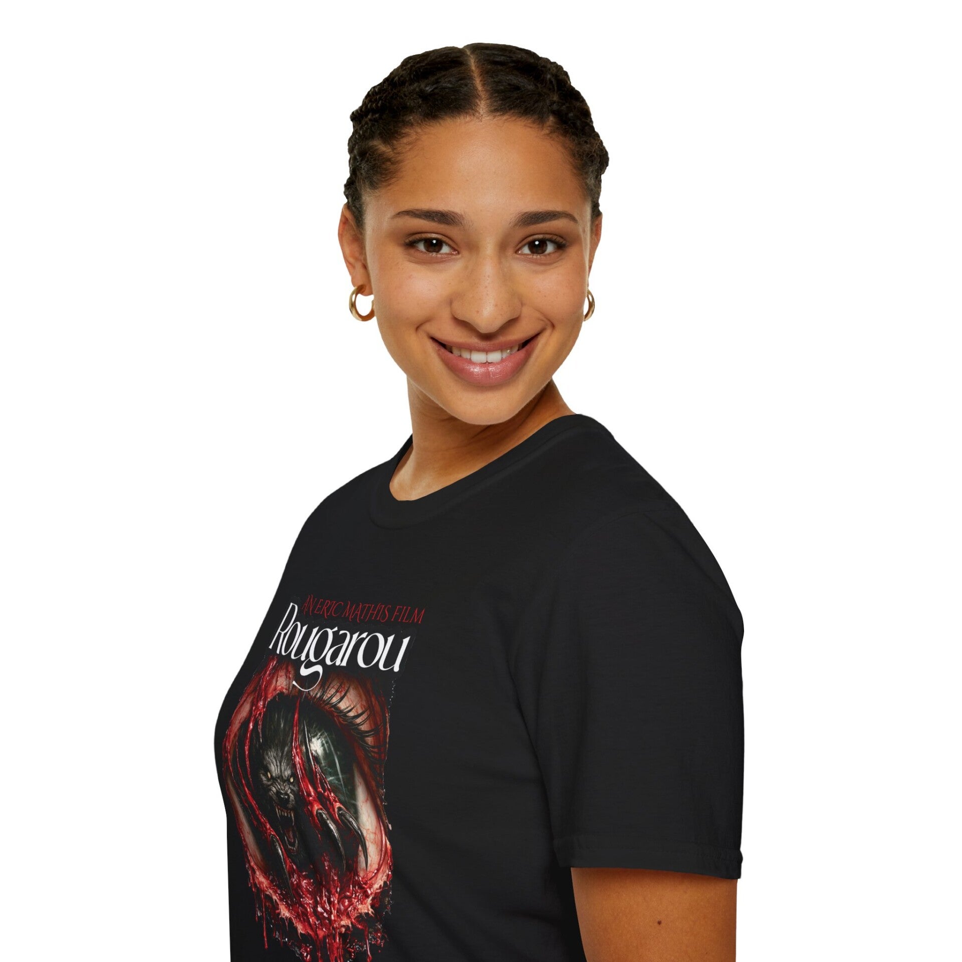 The Rougarou T-shirt features the film’s most iconic image: a savage werewolf clawing its way out of a human eye, blood and torn flesh dripping as the creature forces itself into the world. The design captures the core of Rougarou’s Southern Gothic nightmare. Identity split open. Violence inherited. The monster looking back.